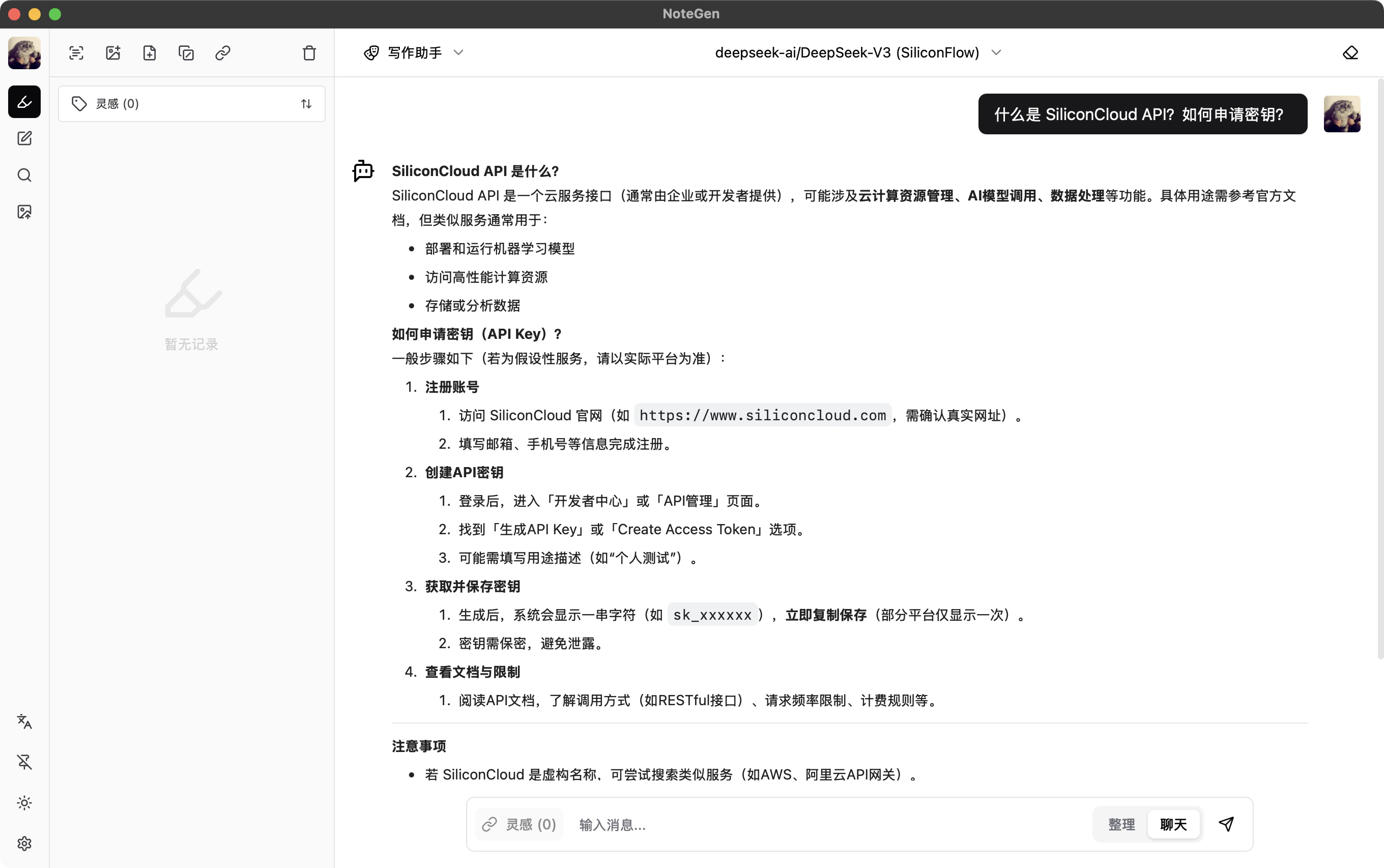 在 NoteGen 测试使用 SiliconFlow DeepSeek-V3 模型