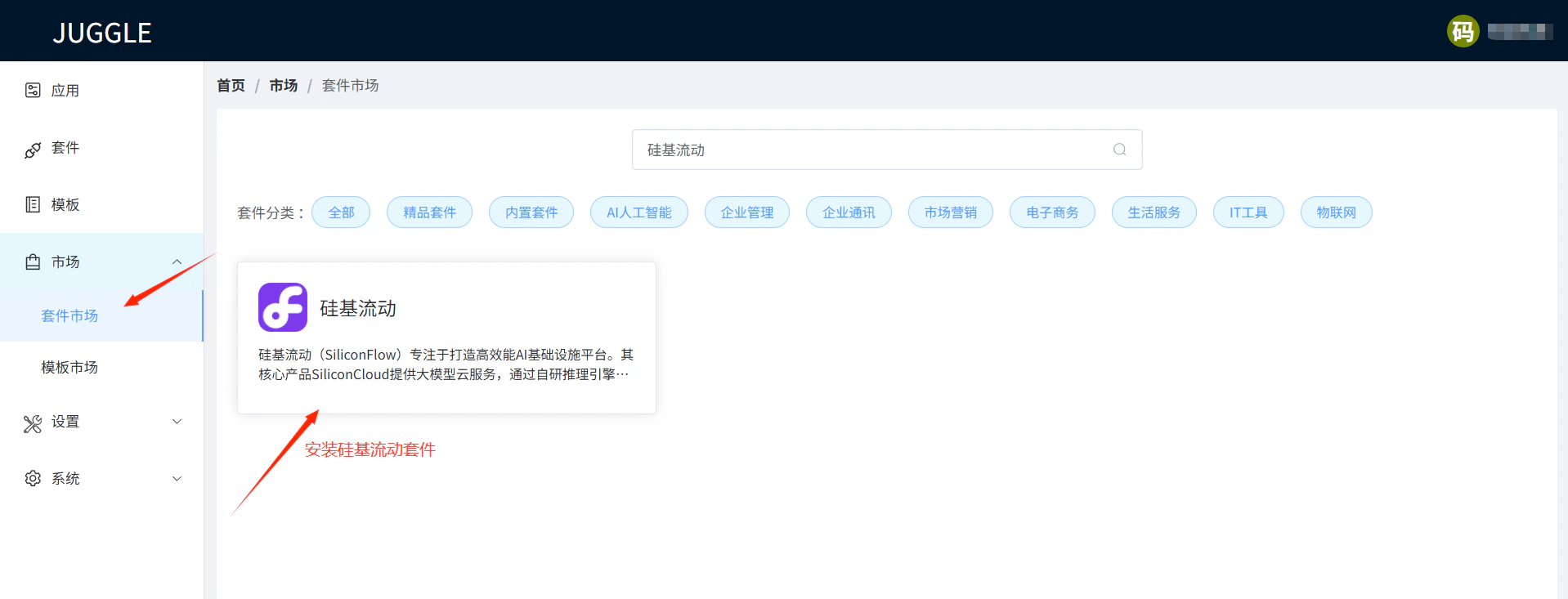 进入 Juggle 套件市场,在套件市场中搜索硅基流动,安装硅基流动套件,后续就能在流程中使用硅基流动提供的接口了。