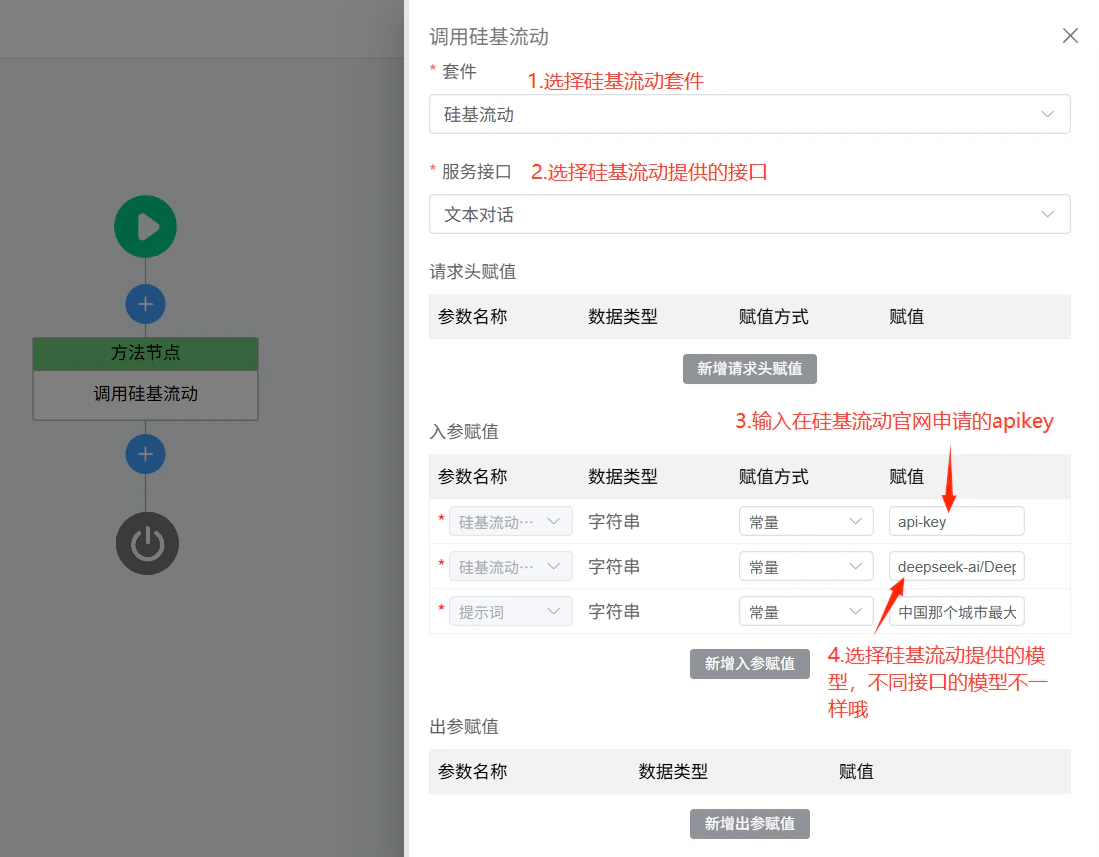 在流程中新建一个方法节点,在方法节点的设置中选择硅基流动套件,就可以选择硅基流动提供的文本对话,生成图片,生成视频等各种接口了,基于这些接口能力,用户可以编排出各种场景的流程,来满足用户的不同场景的需求。