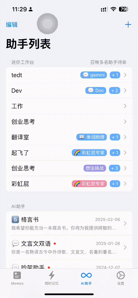 进入「AI 助手」页面,开始添加 AI 助手。 我们从模版中添加「单词助理 🤓」。