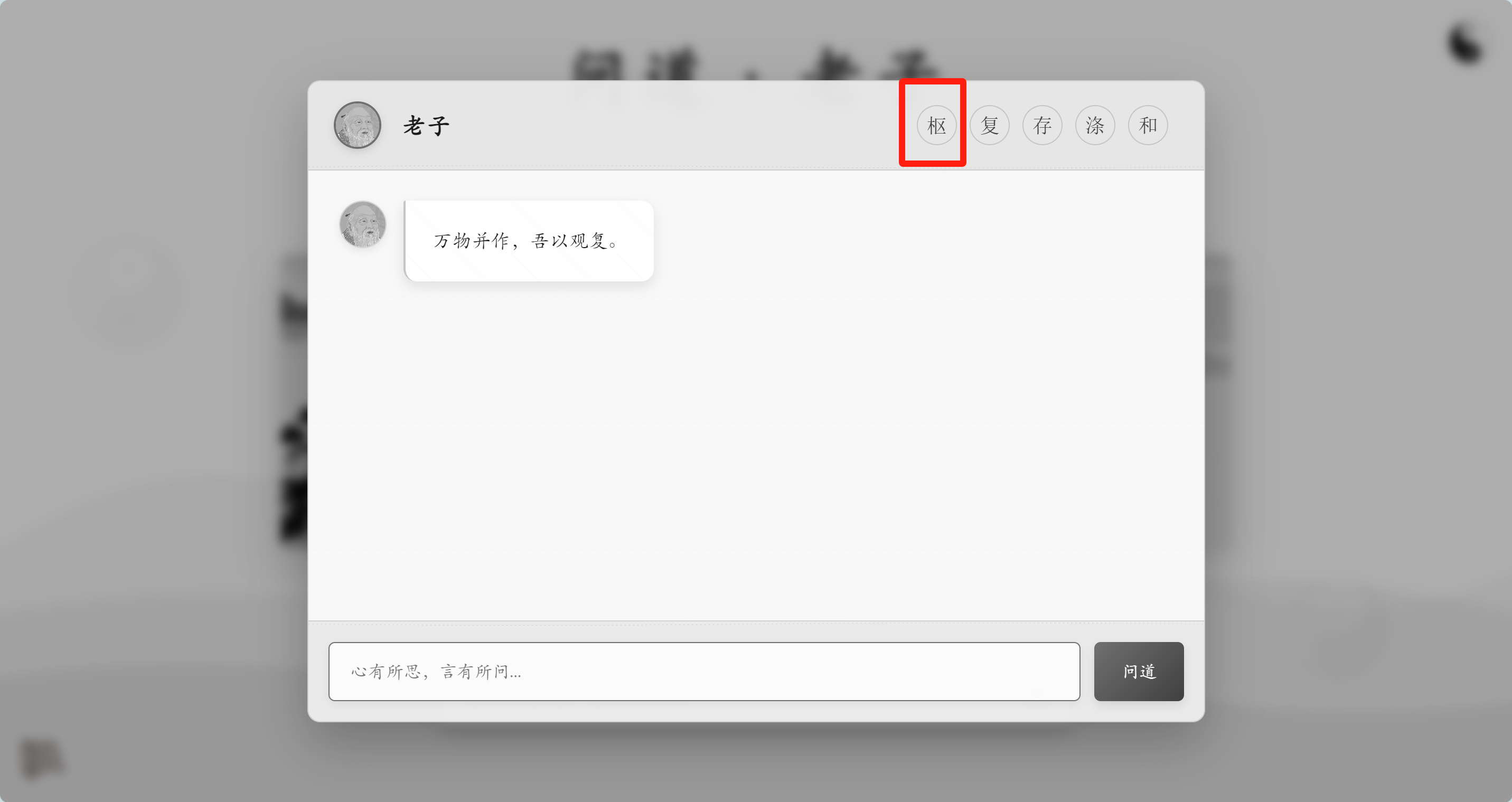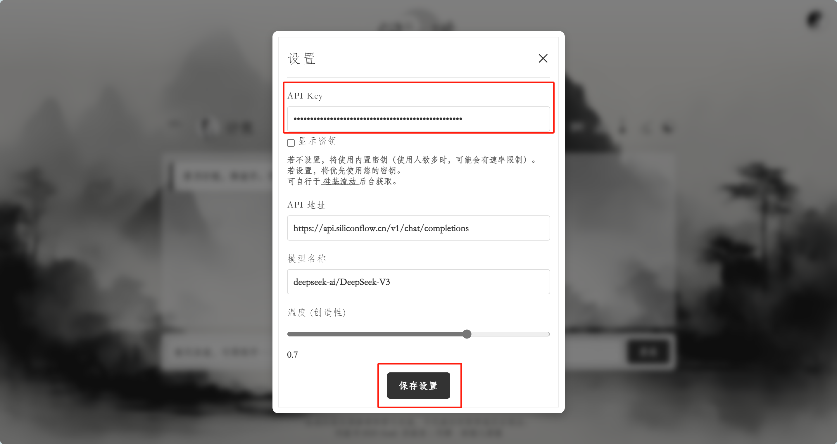 1、On the WenDao homepage, select any character card. After entering the chat window, click the Taiji & Bagua icon at the top right to open the Settings Panel. Paste the API Key you just copied into the API Key field. You can also customize the API URL, model name, and temperature settings as needed. After configuring, click Save Settings to apply.